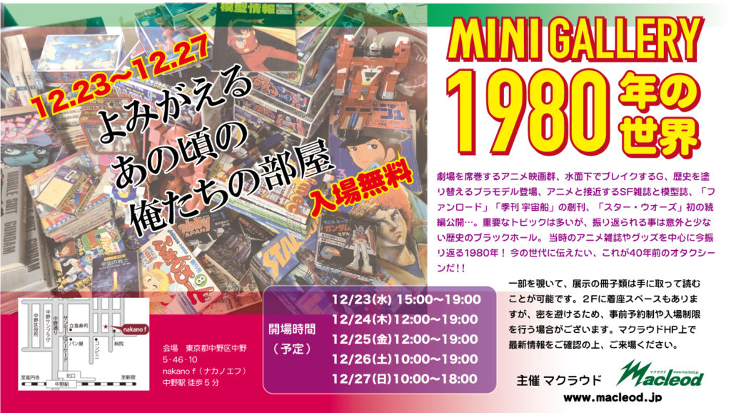 今回の会場、nakano f において、12/23〜27も当方イベント「MINI ギャラリー1980年の世界」を開催いたします。こちらも宜しくお願いします!