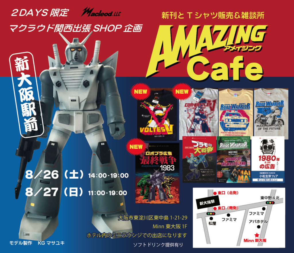 新刊や新作Tシャツもあるので、たまには関西で出店企画やるか!と思い立ちました。先日の「アメイジング酒場」のような飲み屋企画ではありませんが、二日間、ホテルのミニラウンジを借りることができたので、物販&簡単なカフェ企画を実施します。