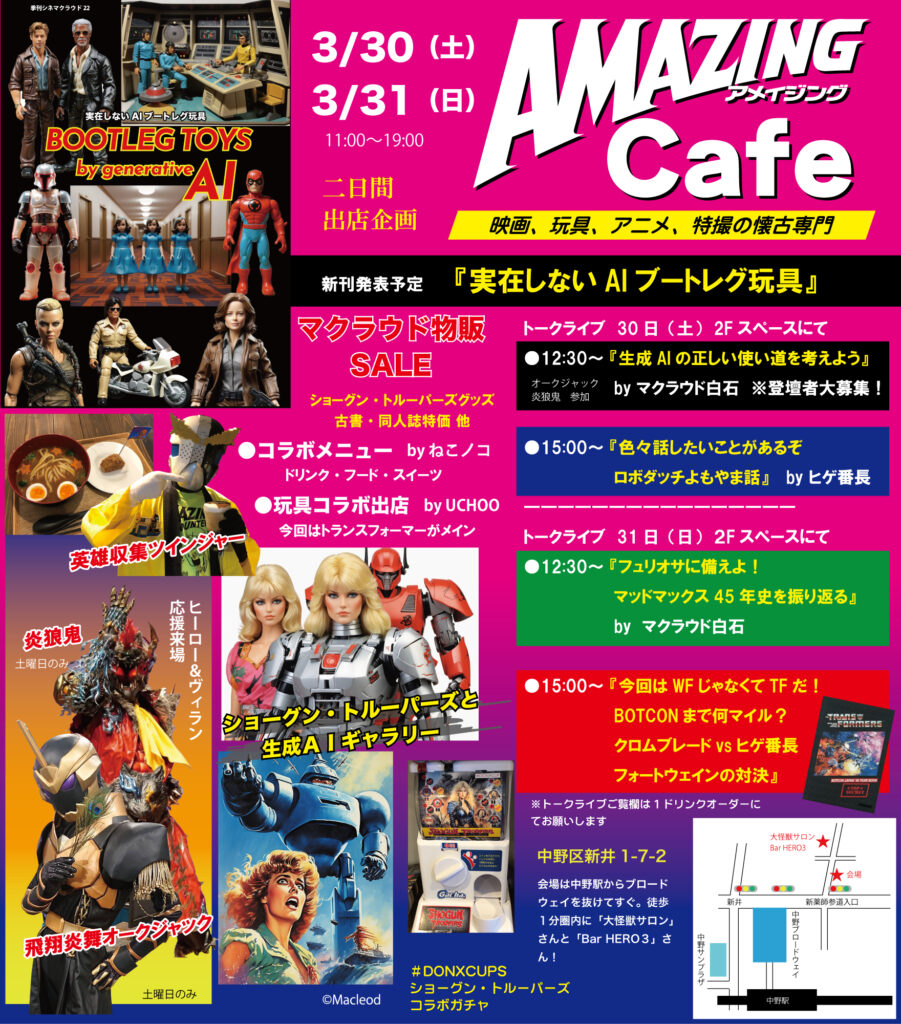 恒例、カフェ企画では今回も、ねこノコさんとツインジャーが参加してくださり、コラボメニューも用意。ドリンク(500円から)をオーダーされた方には、マクラウドオリジナルプリントのコルクコースター(ショーグン〜、アメイジング星人等)を進呈します。配布したコースターは2Fでのトークライブの参加券になります。