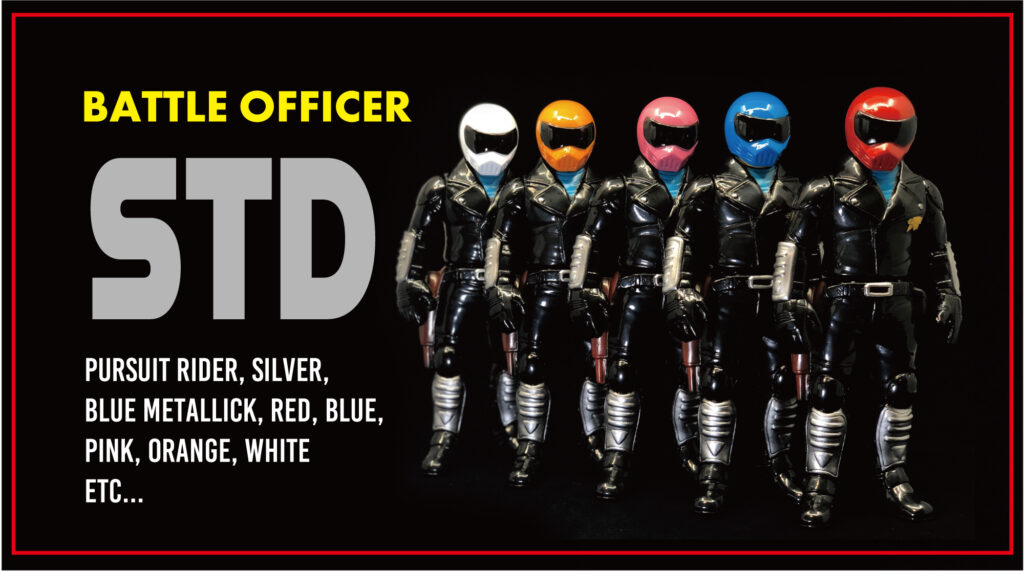 本体ソフビ素体の色を活かしたバージョン。ヘルメットはDXバージョン同様にウレタンクリアでコーティングし、様々なヘルメットのカラーバリエーションを用意しました。本体素体は共通です。お手軽な価格でお好みのバトルオフィサーをチョイスしてください。