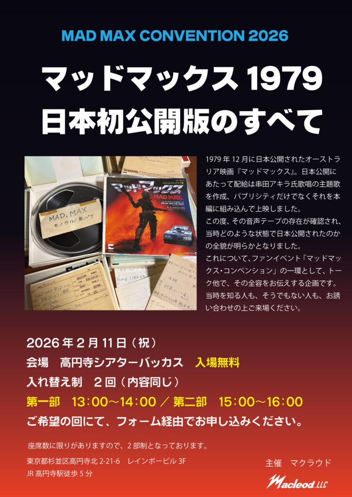 2/11(祝)高円寺シアターバッカスにて、急遽マッドマックス・コンベンションを開催する事になりました。