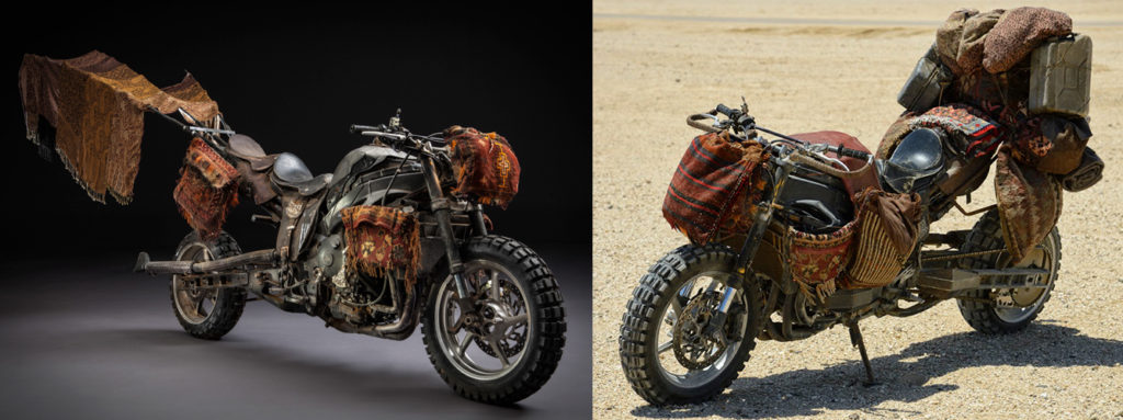 イメージとしては昨年のなんちゃって仕様同様、フューリーロードでマックスが乗る砂漠仕様バイク。右がおそらく撮影前の状態で、左が現場で手を加えた状態だと思われます。