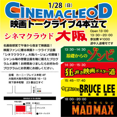 3回目を終えた自分企画の映画トークライブ企画「シネマクラウド」。1/28(日)に大阪、地下鉄本町駅近くにて開催となりました。