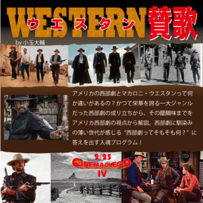 小玉氏、今回は大好きな西部劇啓蒙という使命を背負い登壇です。映画史の勉強みたいな堅苦しくない進行で「ああ、なるほど!」とちょっとためになる、必見プログラムです。前前回の「刑事クロニクル」も一回こっきりで終わるにはあまりにももったいなさ過ぎるカロリー高いネタなので、またやってもらいたいですね。
