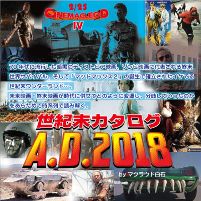 世紀末、終末世界を題材にした映画は古来より色々とあります。「宇宙戦争」や「地球最後の日」のようなカタストロフもの、文明社会がもたらした破滅的な未来、「人類SOS」やゾンビものに見られる“心地よい破滅”。そして活劇の舞台背景として登場した「マッドマックス2」や「ニューヨーク1997」の魅力溢れる世紀末世界。終末映画の変遷をまとめつつ、じゃあ「マッドマックス」以後はどうなの?まで話題にしたいと思います。MADサバ方面の方々が気になる映画の中の世紀末装備の話題も少々。