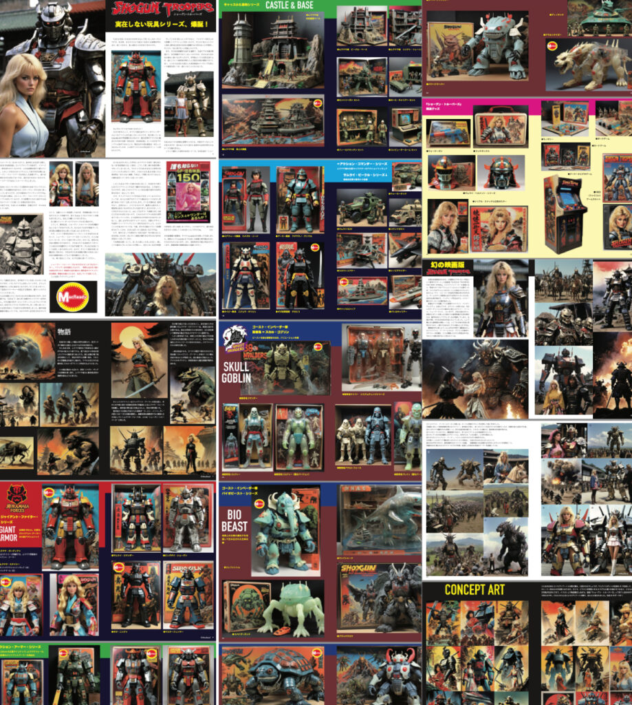 季刊シネマクラウド20は、『誰も知らないSF怪奇映画150』に続き、生成AIを用いたシリーズ第二弾。架空の玩具シリーズ『ショーグン・トルーパーズ』のラインナップ、その映像化作品、コンセプトアートを紹介する、100%虚構の生成AIビジュアルブック!